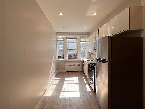NO BROKER FEE Tons of sunlight Modern appliances Close to transportation Newly renovated 1-year lease Credit and background check required Baseboard heating, laundry, water, sewer, and trash collection are included.