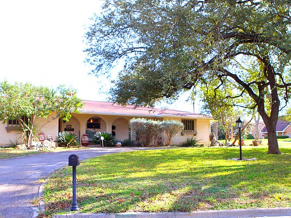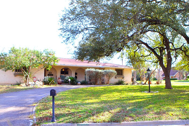 With a beautifully landscaped lawn, mature oak trees, and grand archways at the front entrance, you'll fall in love at first sight with this unique property sitting on a corner lot in one of Uvalde's most prominent neighborhoods! Featuring 3 bedrooms and 3 bathrooms, this listing has it all! Bedrooms are ample in size while both the master suite and the 2nd bathroom feature double sinks and custom tile work. In the spacious kitchen, you will find all stainless steel appliances and a bar-height countertop that opens up to the living room with vaulted, beamed ceilings, making it the perfect family gathering space. Built in 1970, this home has many unique features such as built-in shelving, a family den, eye-catching light fixtures, a beautiful office space, and so much more YOU MUST SEE!!