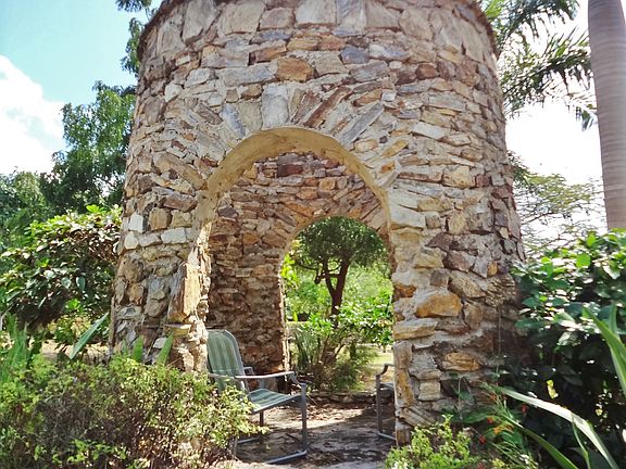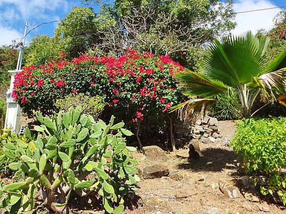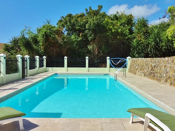 “Sugar Mill Estate Sanctuary” Located hillside on 0.96 acres of lush tropical landscaping w/ fantastic views of South Shore, Ha’penny Bay Beach Club, surrounding hills & valley. This 2BR, 2BA home offers newly renovated kitchen w/ granite counter tops, maple cabinetry & tumbled marble backsplash w/ SS appliances. Expansive living room opens to covered gallery & poolside w/ cabana bar (See More) new diamond brite pool w/ coral stone tile & many sunning areas. Split A/C's in bedrooms & gorgeous renovated baths. Breezes are constant throughout the home & includes a 1BR/1BA apartment below for extra income or guests w/ dual driveways for access! Home has had many renovations & includes 3.5KW generator, large carport, storage shed, gas dryer & UV filtration on water. A true tropical haven!