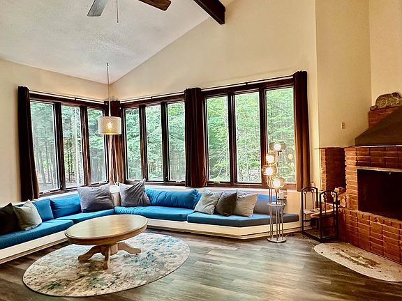 Nestled in the coveted Strattonwald neighborhood, this unique four-bedroom, two-bath home seamlessly blends contemporary style with comfort. Set back on 1.3 acres, it features a spacious deck perfect for outdoor enjoyment. Inside, the home's distinctive charm is highlighted by a cozy wood fireplace and dramatic cathedral ceilings, creating an airy, inviting atmosphere. Conveniently located on the winter shuttle route to Stratton Mountain, it offers easy access to year-round recreational activities. Residents of Strattonwald enjoy amenities like a swimming pond, tennis courts, and a clubhouse, fostering a vibrant community with recreational opportunities for all ages. Security camera on premises. 24 hours notice for appts on July 5&6.