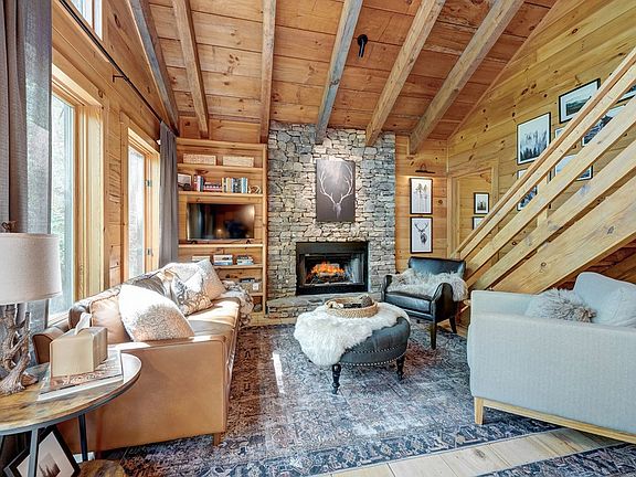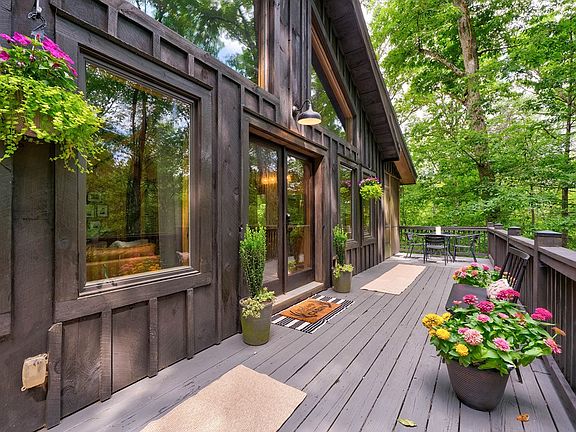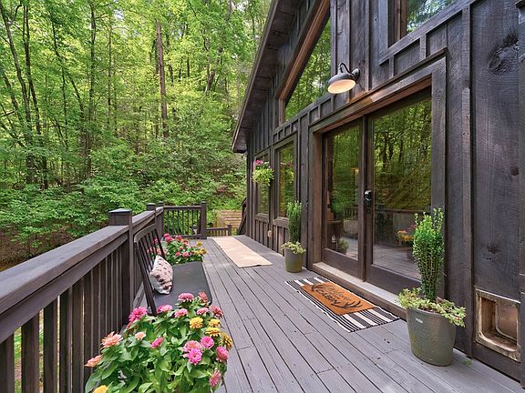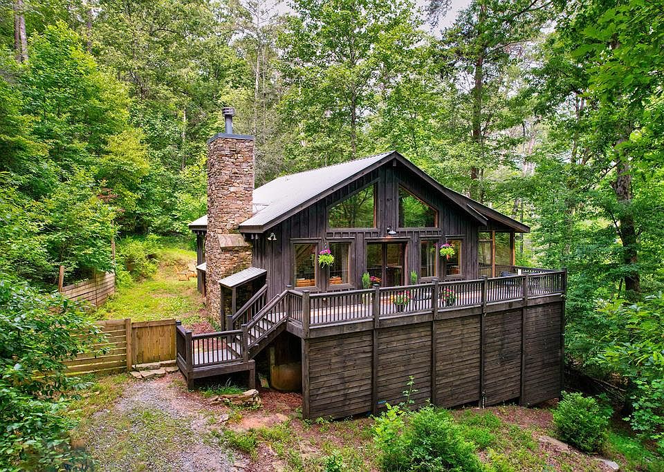 Welcome to your dream mountain retreat—a breathtaking Cypress chalet tucked into the tranquil Blue Ridge Mountains. Recently renovated to blend timeless rustic charm with refined European elegance, this enchanting hideaway evokes the cozy sophistication of a classic European ski chalet, where morning sunlight filters through ancient oaks, and the soothing sounds of Fightingtown Creek lull you to sleep. The recently updated interior boasts soaring vaulted ceilings with exposed wooden beams, a floor-to-ceiling stacked stone wood-burning fireplace, wide pine floors, and a chef's kitchen with modern quartz countertops and stainless-steel finishes. The main floor also features a luxurious primary suite and a spacious second bedroom, both crafted for restful comfort and privacy. Upstairs, a cozy loft offers a peaceful place to watch movies, play classic video games, or curl up with a good book. Walls of oversized windows flood the space with natural light, framing serene forest views and creating a warm, inviting glow reminiscent of alpine lodges. Outside, the wrap-around decks and screened-in porch invite you to unwind and connect with nature, making this cabin feel like a cozy treehouse nestled among towering trees. This meticulously updated cabin is only minutes from charming downtown Blue Ridge and walking distance to trophy trout fishing.