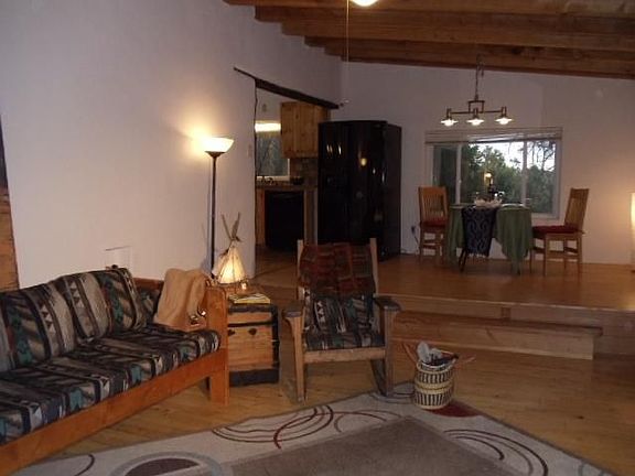 Delightful handcrafted Mountain Retreat Home 10 minutes from town located on an easy accessible driveway right off the trail situated on 5.5 private acres with mountain and forest views. Lovely finishes, and plaster walls throughout, with wide plank pine floors, in addition to polished concrete,and tile. Newly remodeled and updated, stone kitchen counters, Jacuzzi bath, pro panel roof, and clerestory windows add to the charm and comfort. There's a handsome meticulously handcrafted stairway rising up to the master bedroom that is a visual delight. The home is filled with sunshine offering a flexible floor plan, south facing sunroom and separate studio not included in the square footage,a shared well with one neighbor, auto drip irrigation all around, and charming outdoor spaces to enjoy. You'll feel like you are on vacation. Come see today!