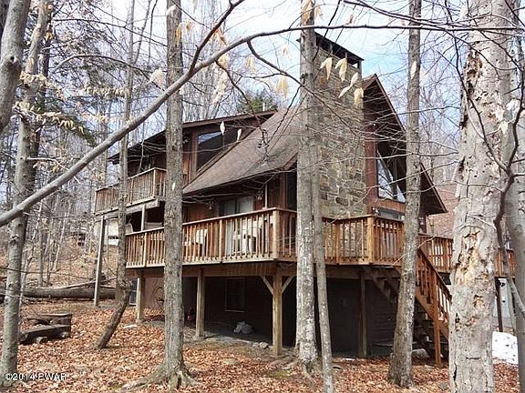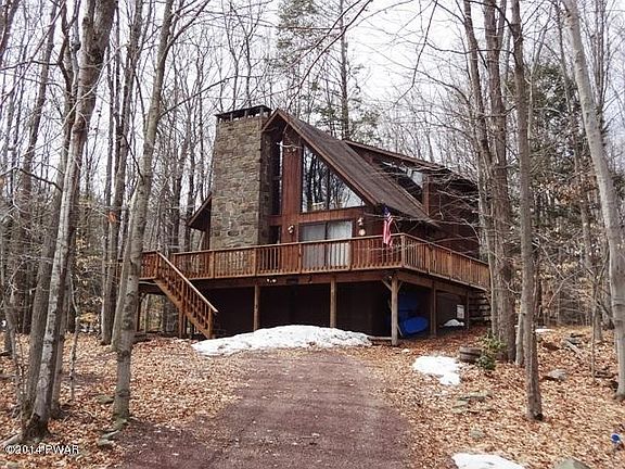 Walk to the Big Lake and the indoor pool from this streamside Chalet in Wallenpaupack Lake Estates! This rustic home has all the right stuff, including a seasonal view of Lake Wallenpaupack. In addition to a premium location the master bedroom of this home is huge and complete with a whirlpool tub and private balcony overlooking the stream. The main living area is open with a cathedral ceiling a floor to ceiling magnificent stone fireplace. With 4 bedrooms and three baths everyone will be more than comfortable.The family room and loft add the perfect 'away spaces" for those that want a reprieve from the fun. You'll get lots of use from the garage which will surely house your golf carts and wave runners! This location is a rare find.