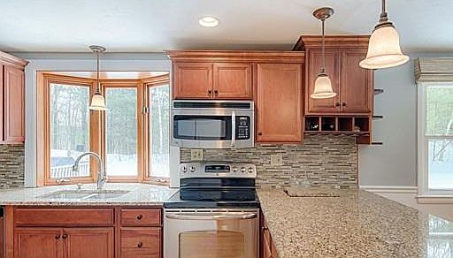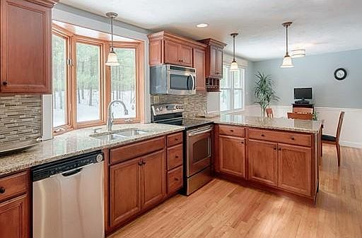 Beautifully maintained ranch style home set on a lovely level lot offering 3 bedrooms, 2.5 baths and an attached 2 car garage. The stunning updated kitchen features an open floor plan with granite countertops, tiled backsplash, breakfast bar and a sunny dining area. The spacious living room offers a fireplace with a wood burning stove insert. The newly carpeted family room leads to the large deck overlooking the level, private backyard. Hardwood floors throughout the kitchen, living room and 3 generous sized bedrooms. The finished lower level is great for entertaining, complete with a pool table and fireplace, full bath, laundry room and plenty of storage. Conveniently located near Route 140 and 290 and the renowned Cyprian Keyes Public Golf Club.