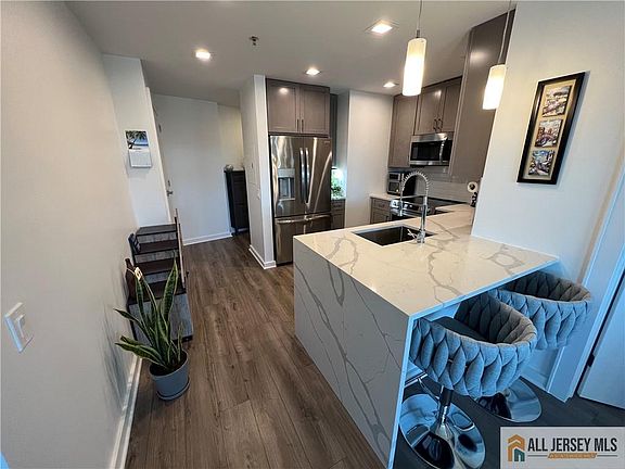 Stunning 2 bedroom, 2 full bath end unit condo located directly across from the train station, right in the heart of bustling downtown Rahway! This 11th floor unit features a renovated eat- in kitchen w/SS appliances & plentiful cabinets & counter space, updating flooring, & a large open living space! 2 generously sized bedrooms, one with a renovated en-suite full bath. Another beautiful full bathroom can be found between the living space & 2nd bedroom. In unit laundry offers added convenience. This high rise building comes equipped with a fitness center, rooftop deck, restaurant, 24 hour security, & more!