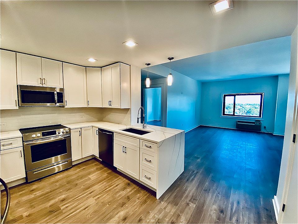 Be the first to live in this Newly Designer Renovated Condo. The home is directly across the street from a short Train ride into NYC. It is centrally located in Downtown Rahway with very lively Restaurants, Boutique Shops, Doggy Daycare, Ice Creams Shops and much more. This home features the very desired open concept with 9' ceilings. Upon entry, the kitchen features white, waterfall style, quartz tops, Floor-to-ceiling white cabinets & stainless-steel appliances. The living space features a breathtaking view of the NYC Skyline and has lots of natural light. Both bedrooms also have NYC views. The Primary Bath includes a double sink vanity with a quartz top. Washer and Dryer in unit. Large and spacious closets. The Primary has a very large walk in closet. Amenities include concierge services, lobby restaurant and lounge, fitness center, rooftop lounge w/BBQ & seating area, covered parking, business center and meeting space.