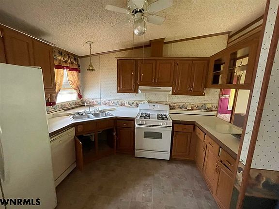 MUST SEE, SPACIOUS DOUBLE WIDE MOBILE HOME SITUATED ON A LANDSCAPED LOT IN EVERGREEN ESTATES, GERING. FEATURES INCLUDE ATTACHED 1 CAR GARAGE AND YARD SHED. INCLUDES WASHER AND DRYER, LARGE KITCHEN AND ALL KITCHEN APPLIANCES. 3 BEDROOMS, 2 BATHROOMS . LARGE FORMAL LIVING ROOM AND DINING ROOM. SOLD AS IS.