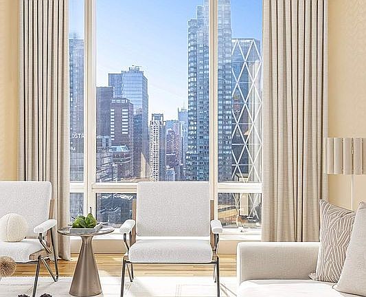 Spanning 2,165 square feet, the Robert Couturier designed three-bedroom apartment enjoys truly phenomenal views from the 34th floor and is a glorious haven above the city, gorgeously appointed in every way.