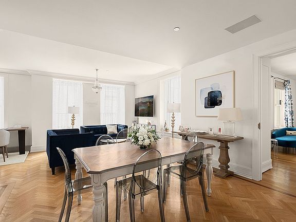 The spacious primary suite features a walk-in closet and a beautifully renovated en-suite bath with mosaic tile flooring inspired by the Plaza’s iconic lobby. Fixtures by LeFroy Brooks and Kohler, including the signature double P insignia, add a bespoke touch. Additional highlights include generous closet space, a second full bathroom, and the convenience of an in-unit washer and dryer.