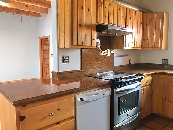 Sweet house with large walled front courtyard and fenced back yard. Home features saltillo tile floors, Mexican tile in main bathroom, clawfoot tub in 2nd bath, updated kitchen, kiva FP in owner's bedroom, wood stove in living room and extra storage in garage. There is a shared well with one neighbor, large water catchment tank for landscape use and water feature in courtyard. Two-car garage currently only fits one car but could be changed back to accommodate 2 cars. This is a great passive solar home ready for its new owners:)