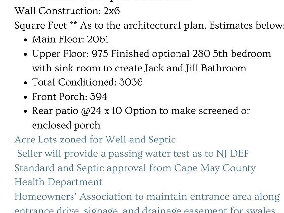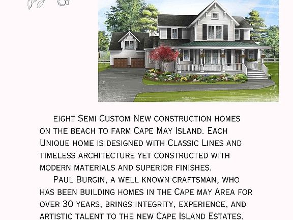Houses Plan under contract on lot 15.13. Switched lot as shown on Brochure. Welcome to Cape Island Estates. A few homes of the eight semi-custom new construction neighborhood have been released for sale on our beach to farm Cape May Island. Each unique home is designed with classic lines and timeless architecture yet constructed with modern materials and superior finishes. Easy access to all that Cape May Island has to offer with privacy of large lots and exclusivity of designer construction. This model can be expanded by enclosing the rear patio, adding a powder room in the mud room, finishing a storage area on the 2nd floor to create a 5th bedroom and a jack-and-jill bathroom, adding a garage (as shown in the artist rendering), pool, pool house, and more. Paul Burgin, a well-known craftsman, who has been building homes in the Cape May Area for over 30 years, brings integrity, experience, and artistic talent to the new Cape Island Estates. Acre lots set far off Seashore Road (see subdivision). Church Street is a new street and not on maps as of yet. Please see the full brochure. There will be a Buyer coordinator to assist through the process. Anticipate June/July 2025 closing, depending on the Contract date.