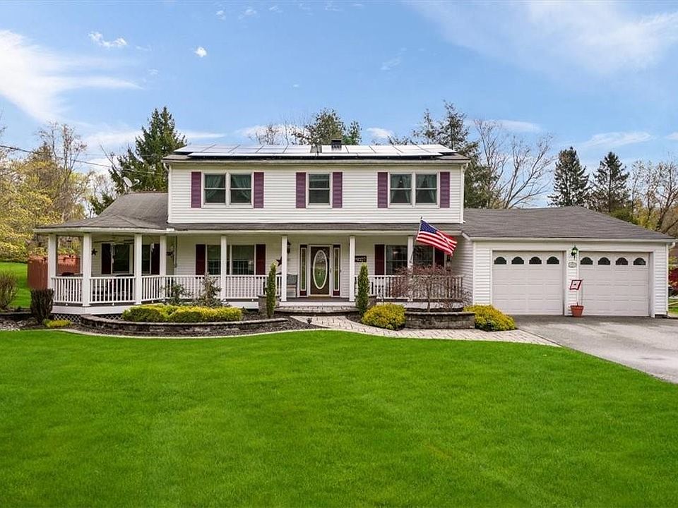 Inside, the main floor offers a convenient first-floor bedroom, a full bath, and separate guest quarters, providing ample space for visitors or multi-generational living. The highlight of the home is the grand family room, featuring radiant heat, a cozy gas fireplace, and walls of glass that showcase the serene backyard oasis, complete with an inground pool and meticulously landscaped grounds. The heart of the home is the spacious updated granite kitchen, equipped with stainless steel appliances and plenty of room to accommodate gatherings, making it the perfect setting for holiday celebrations and everyday living. Upstairs, the master suite is truly fit for royalty, offering a tranquil retreat with its own luxurious en-suite bath. Additionally, there's a princess suite with a full bath, while the remaining bedrooms share another full bath, providing comfort and convenience for all. This Highland Mills residence boasts hardwood floors, crown moldings, and updated baths and kitchen, ensuring both style and functionality. Plus, with central air conditioning and split air systems, as well as a recently installed Amtrol hot water heater, you will enjoy comfort and efficiency year-round. But that's not all - enjoy the added benefit of leased solar panels from Infinity Solar, providing sustainable energy solutions that will not only reduce your carbon footprint but also save you money on your utility bills! Situated in one of Woodbury's premier locations, this home offers the best of both worlds - just 1.5 miles from highways, shopping, and the renowned Woodbury Commons, yet tucked away on a tranquil cul-de-sac in the Monroe-Woodbury School District. Additional Information: Amenities:Guest Quarters,Pedestal Sink,Stall Shower,HeatingFuel:Oil Above Ground,ParkingFeatures:2 Car Attached,