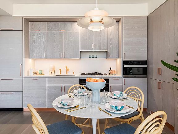 A welcoming foyer adorned with a walk-in coat closet flows into a spacious open-concept living room, dining room, and kitchen saturated with natural light. The kitchen is equipped with sleek white quartz countertops, custom oak millwork, and fully-integrated appliances from Miele including a 4-burner gas range, 30" refrigerator, oven, and speed oven. The bedroom has a large reach-in closet and easy access to an immaculate full bathroom with custom Waterworks fixtures and radiant heated floors.