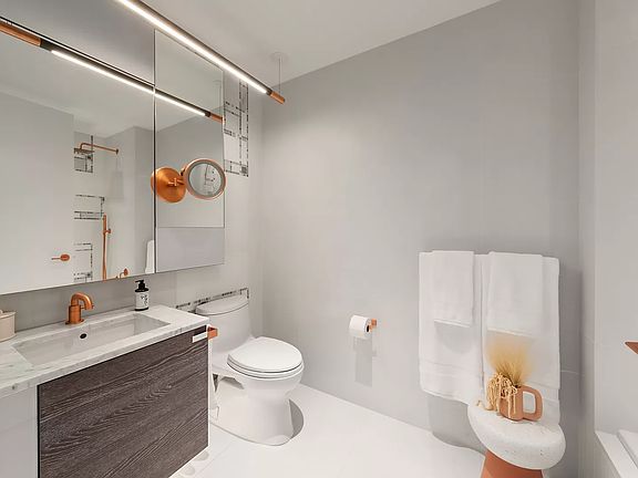 A pristine residence nestled in the prestigious Brooklyn Point development, this stunning 1-bedroom, 1-bathroom home is a portrait of contemporary Brooklyn living. Features of this 739 sq. ft. home include beautiful wide plank stained oak floors, floor-to-ceiling windows with southern exposure and panoramic views of Brooklyn, an in-home washer/dryer, and a harmonious light wood color palette with satin copper fixtures and finishes designed to accentuate space and natural light.