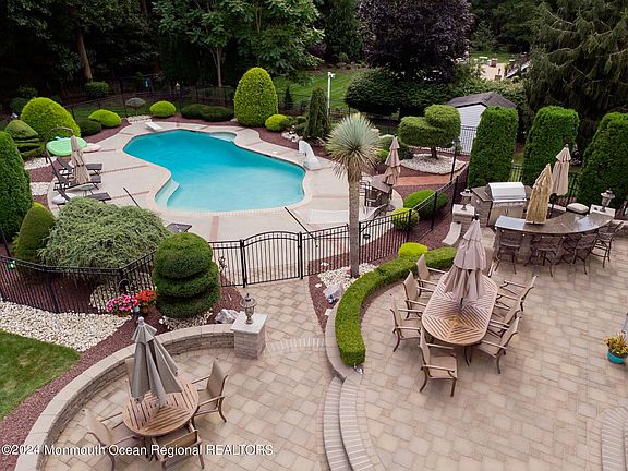 Captivating luxury center hall residence with full brick front in Sheffield Estates, featuring a chef's dream kitchen with timeless custom cabinetry, an extra walk-in pantry, and a designer shaped, spacious center island. High-end stainless steel Thermador appliances with LG commercial extra deep refrigerator adorn the kitchen, complemented by a breakfast nook open to the family room, showcasing a rare Russian oak wide plank flooring. Enjoy the ambiance with a sound system wired in many areas of the home. The family room provides convenient access to dream come true yard with two sliding doors on either side of a stone-faced wood burning fireplace as focal point. Large private office with double doors, elegant formal living room with French doors to the formal dining room. Bay windows add extra charm to rooms. The renovated baths showcase custom cabinetry, sky lights, creating an elegant and cohesive design. Master bath suite, his and her closets, his and her sinks and vanity space, expanded shower with glass doors, soak away stress in your extra large jacuzzi soaking tub. The enormous fully finished basement offers a wine cellar, professional gym, and entertainment area. Cathedral ceiling entryway, with motorized chandelier for easy access, tray ceiling in dining room and master bedroom. The property, spanning over and acre with nature preserved land behind the home for even more privacy, includes an outdoor kitchen, multi-level patios, a pristine heated gunite in-ground pool, and a designated space for play set area. This largest model in Sheffield Estates comes complete with a 3-car garage, a whole house generator, and meticulous maintenance from its sole owner. Commuter bus and parking nearby and available. Restaurants, shopping, parks, within close proximity. Experience luxury living at its finest for your fondest new memories.