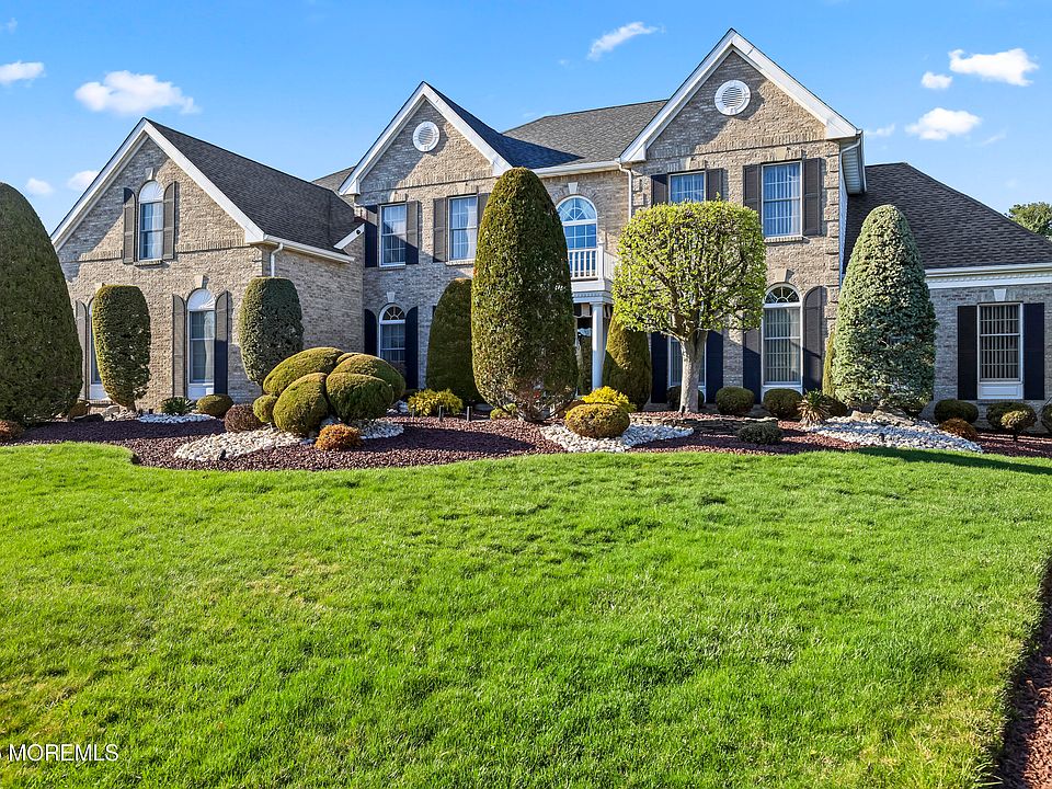 As you step inside, you're greeted by a grand two-story foyer with a curved oak staircase, setting the stage for the elegance throughout. The formal living room is bathed in natural light, thanks to large windows and recessed lighting, and adorned with decorative moldings that enhance its charm. French doors open into the oversized conservatory, where vaulted ceilings and a wall of windows await. The spacious study, also with French doors, leads to the expansive two-story great room, highlighted by a full stone gas fireplace perfect for both cozy nights and entertaining. The gourmet kitchen is a chef's dream, featuring 42" wood cabinetry, sleek granite countertops, a center island, and a cast iron sink with garbage disposal. Just off the kitchen, the solarium offers a wine bar, vaulted ceilings, two skylights, and triple French doors that open to the outdoor entertaining area, making it an ideal space for hosting gatherings. The formal dining room, with a tray ceiling, sets the scene for elegant holiday dinners. A private back staircase leads you to the second floor, where you'll find the luxurious primary bedroom suite. This serene retreat includes a coffered ceiling, a beautiful sitting area, and an expansive 10x20 walk-in closet with custom built-ins. The en-suite bath is a spa-like sanctuary, complete with dual sinks, a Jacuzzi whirlpool tub, a walk-in shower, a private toilet area, and custom tilework. The second floor also offers three additional spacious bedrooms, one of which is a princess suite, and a Jack-and-Jill bath between the other two. A beautifully decorated full basement, with poured concrete, provides ample space for recreation and storage. Step outside to the tranquil backyard, where you'll enjoy an oversized paver patio, breathtaking custom landscaping, accent lighting, and a serene pond with a waterfall the perfect backdrop for outdoor relaxation. Additional features include a 3-zone HVAC system, an Ultra HD Timberline roof, and Anderson 400 Series windows. Conveniently located near transportation, shopping, and a variety of amenities, this home is a rare gem in one of East Freehold's most desirable neighborhoods.