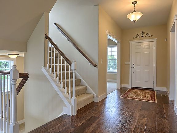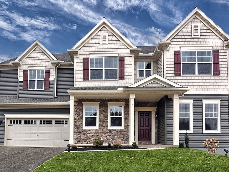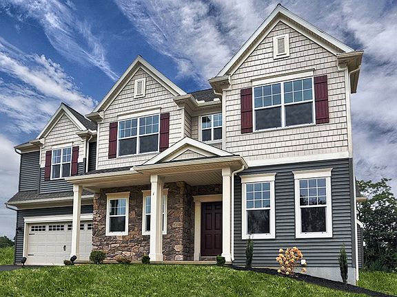 This spacious 2-story home, which serves as the model home and sales center for Greystone Crossing features a welcoming front porch, a 2-car garage with a large, finished mudroom entry, complete with wooden lockers and a built-in desk.. The first floor is designed with heightened 9' ceilings, open living spaces, a and a Flex Room to serve as a study, living room, or other flexible living spaces. The open Kitchen features large crown molding on the cabinetry, granite counter tops with tile backsplash, a convenient breakfast bar, stainless steel appliances, a corner pantry, and hardwood flooring that extends to the Dining Room and Great Room. In the Great Room, a cozy gas fireplace with a raised hearth is gracefully flanked by windows. The Dining Area is tucked toward the back of the home, adjacent to the Kitchen, and includes lots of windows as well as access to the back yard patio. On the way up to the 2nd floor, a built-in window seat adorns the stairway landing. In addition to 4 bedrooms and 2 full bathrooms on the 2nd floor, a large Rec Room with built-in bookshelves provides plenty of space for relaxing, studying, or playing. The Owner's Suite features an expansive walk-in closet and a private bathroom with a 5' shower and cultured marble double vanity top.