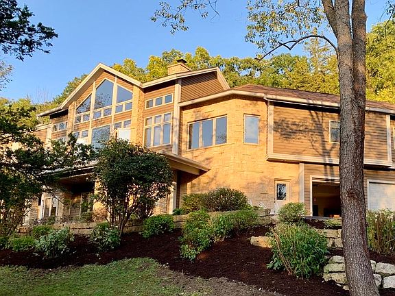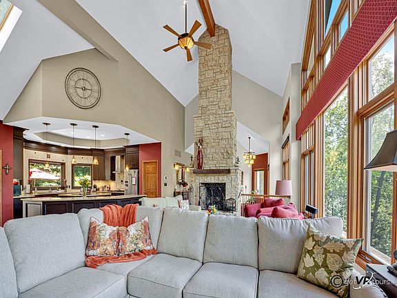 NEW ROOF November 2022! To see is to believe... Galena is full of hills and valleys and breathtaking views, and this home proves it! No city noises or busy downtown streets here...just a beautiful natural hillside and spectacular sunsets from this one-of-a-kind custom-built home featuring gorgeous updates and both indoor and outdoor entertainment areas! Wind your way up a new (2020) asphalt & sealed (2022) driveway to an oversized parking pad and two-car radiant heat floor garage, finished wine cellar with Chicago brick floor, faux tin ceiling with crown molding and LED uplighting, mini chandelier, and custom wine racks. Enter this five bedroom, five bath home from the garage, the oversized mudroom, or the main entry door. Once inside, you are greeted with a grand, curved stairway with open views to the main living area above and a mammoth 30-foot limestone fireplace, reaching to the second floor vaulted ceiling. The ground floor of this home includes radiant heat floors, three bedrooms and three full bathrooms. The first full bath with shower is directly across from the mudroom to allow for quick changes after a playful day on the slopes or hiking the Territory trails located just across the street. Double lead-glass doors greet you as you enter the "pilot's lounge" rec room, a gathering space with its own kitchen (including dishwasher, bar sink, refrigerator, and oven), custom coffered oak ceiling, and new custom acrylic counter with copper prep sink. A walk down the hall leads to three bedrooms: a guest suite with sliding doors to the front porch and sitting area and private bath with shower and a second and third bedroom with jack-and-jill bathroom with a tub/shower combination. Third bedroom is also accessible from the pilot's lounge rec area. Bedrooms are complemented by bedside sconce lighting, large closets, custom window coverings, and handmade valances with large windows overlooking the front porch and expansive yard. Ascend the winding staircase to the main living area to find the large master bedroom suite with separate private den and fireplace with rear patio access, large en suite bathroom with soaking tub, double custom glass tile vanity, two walk-in closets, and a walk-in shower with rain shower, three vertical massage jets, and handheld shower head with built-in bench. A laundry room complete with custom cabinetry, and rear patio access with even a shower for your furry friends is just down the hall from the master suite. Another large suite is on the opposite side of the home and includes a large bedroom with rear patio access, a jacuzzi tub, shower, and hand-crafted wall finishes, tile, and mirror. One of the most beautiful features of this home is the expansive upstairs great room, featuring a vaulted ceiling with grand fireplace and new wifi-enabled motorized window shades (2021) and UV-tinted transom windows (2021), huge kitchen with two islands (one a massive octagonal prep space with bar sink; the other a curved bar separating the kitchen from the living and dining areas), two sitting areas (one beside the fireplace), and dining area with sliding doors to the rear patio, deck, seven-person spa, and outdoor fireplace. From the start of the driveway to the private wooded hillside at the rear of the home, every turn brings an unexpected surprise! In case this secluded home on 2.69 acres is not private enough, owners are including the 2.14 acre adjacent wooded lot in the price. Home is not in any rental program, has fiber optics and optional natural gas access. A visit to this unique home would not be complete without letting Alexa know you've arrived. Tell her "It's Happy Hour," and enjoy her response as she sets the mood for sunset in this gorgeous grand space. Then tell her "Goodnight," and she will prepare the home for rest. Located in the Galena Territory, where miles of hiking trails, four golf courses, and owner's amenities await you! Owner is a licensed real estate broker in Illinois and Flor