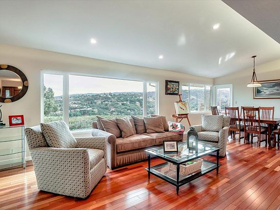 This home is a rare find in San Carlos. Perched on a large lot at the end of a cul de sac, this property has stunning views of the hills. You experience privacy while enjoying the natural beauty of the Peninsula or gaze at exciting evening views with sparkling lights. The floor plan is highly functional with many options for entertaining, work from home and distance learning. The sellers have updated the kitchen and bathrooms, installed beautiful Brazilian cherry floors, and replaced windows. This floor plan makes perfect work-from-home spaces with many possibilities. Upstairs, there are three bedrooms, including a wonderful master bedroom that has lovely views. Downstairs, there is an expanded living area and a second master bedroom that can work perfectly as an in-law area, private office or au pair suite. This area could also be a home/school area or two home offices with separation from the top floor. The back yard has ample room for play space, outdoor entertaining or gardening.