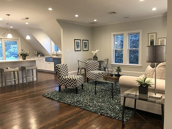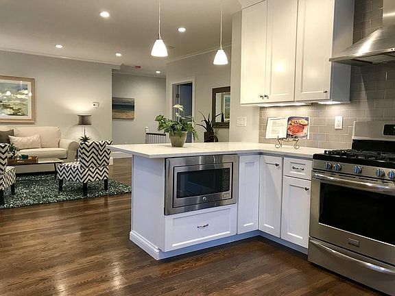 Deluxe Craftsmanship shows in the restoration of this 1800's Queen Anne Beauty! Luxurious bi-level living with much attention to detail with 3bedroom, 3full baths. Open floor plan with jacobean hardwood floors makes for great entertaining along with surround sound through out the unit, sound deadening system in place too! White timeless kitchen with soft close cabinetry dressed with quartz counters, SS appliances with apron sink, slider out to composite deck includes speakers to sound system. 2 master en suites the choice is yours! main level master on suite with beautiful carrera marble, seamless glass doors and ample size walk-in closet. 2nd master on suite occupies the 2nd level with natural stone shower, pebbled flooring, seamless glass doors, sun-dreached with skylights, private tree top office in turret. Carrier HE Heat/AC, exclusive outdoor space with designated shed, basement storage, off street parking, Walk to Village, T & Rail. Call for your private tour