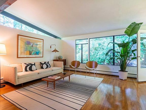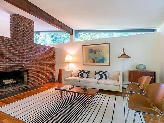 Amazing private location at the top of a cul-de-sac, overlooking the Landlocked Forest in the Turning Mill Neighborhood, 1 Dewey is a Walter Pierce-designed Peacock Farm-style house. The warm hardwood floors, soaring ceilings, huge windows, and open floor plan are just some of the key features of Pierce's pioneering and award-winning design that we love. The abundant natural light that streams through the big windows of this classic post-and-beam home creates the indoor-outdoor symbiosis that discerning midcentury-modern buyers crave. One Dewey Road highlights include 3-plus bedrooms (including a master with en suite half bath), an oversized 2-car garage, a composite deck overlooking the .79-acre lot with wooded privacy, a 2019 roof, a '18 heating boiler, '19 breaker panel, refinished hardwood floors, as well as new interior and exterior paint. With bonded membership in the Paint Rock neighborhood pool and close proximity to the young Estabrook School, Turning Mill is highly desirable