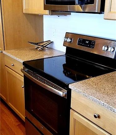 A refreshing change- a private townhouse residence located downtown with an attached two garage in an area surrounded by high rise apartment buildings. Newer modern Townhouse with a traditional look in the heart of Downtown Stamford. Walk to fine dining, entertainment and shopping. Close to Metro North RR Station. Lovely hardwood floors throughout this sunny and spacious townhouse, with oversized windows. There are two over sized bedrooms and 2.5 baths with ample closet space, 9 foot ceilings. There is an incredible Master Suite with walk-in closet & beautiful bathroom. The bright, modern kitchen with newer stainless steel appliances, granite counters, good quality wooden cabinetry. Formal Dining Room. Full Size Washer Dryer on main level. First level has roomy office/den. There is a huge unfinished basement for storage. Large two car garage.Tenant pays for all utilities - economical gas heat, electricity, water, sewer. LL pays for snow removal/landscaping/trash. Positively No Pets. Excellent credit and references are required - two month' security deposit. A great value for such a large, downtown townhouse in excellent condition.