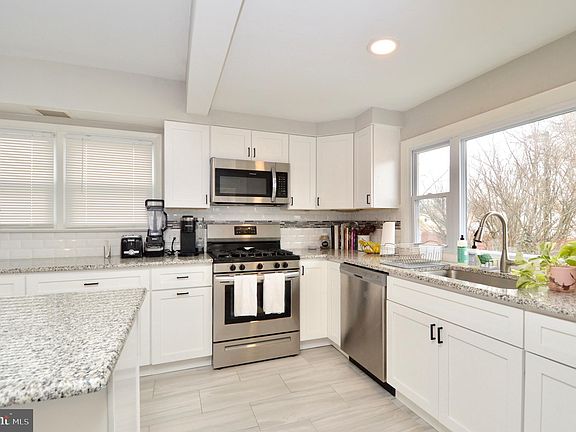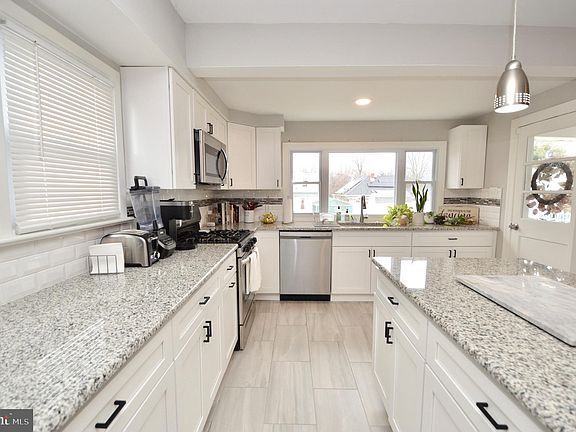 This is a beautifully updated 3 bedroom home in a great Barrington location with easy access to the Patco and I-295. The home offers great curb appeal featuring a large, inviting front porch with updated decking, beautiful windows on the first floor and updated roof! Inside, this home is so charming with hardwood flooring in the living room and dining room, custom trim around the windows and custom window treatments. The kitchen is renovated meticulously with stainless steel appliances, shaker style soft-close cabinets, modern subway tile backsplash and neutral colored granite countertops. It also features an island with pendant lighting and an oversized picture window above the sink overlooking the large backyard. The hardwood flooring continues up the stairs, hallway and all three bedrooms. The full bathroom has been updated with tile flooring and modern gray tile shower/tub. This home has great storage space with a large hall closet and two walk-in closets in the primary bedroom. There is also a full basement that is clean and ready to be finished! The backyard includes a back porch off the kitchen that leads to a brand new patio. This home is move-in ready. Schedule your private showing today!
