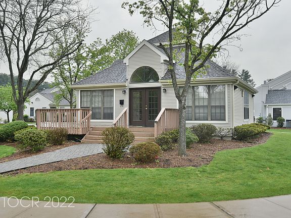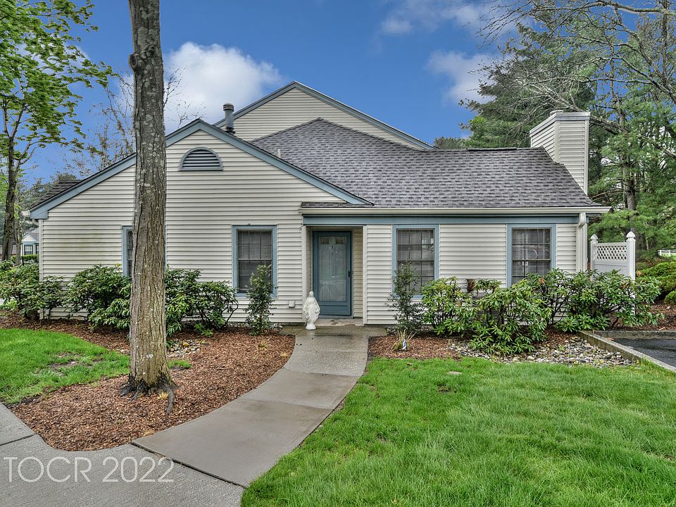Welcome to Pond Meadows, a 55 and over adult community. This popular ranch style end unit has NO STAIRS and is very close to the assigned parking spot and guest parking. The unit consists of living room with cathedral ceiling and fireplace, dining area, kitchen, 2 bedrooms, utility/laundry room and full bath with SOT, sliding glass doors to patio. Pergo Floor installed in LR, DR and kitchen. The home has been newly painted and new blinds have been installed in every window. View of pond from the front of the home! Maintenance includes water and sewer.