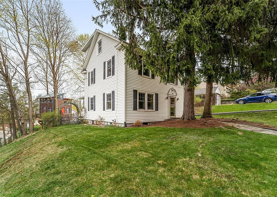 South Side three story on corner lot with charm galore! All original woodwork throughout with beautiful hardwood floors. Stone wood burning fireplace with beamed ceilings in the living room provides a classic tudor style feel. A warm and welcoming foyer. Finished attic that could be set up for a multitude of uses. Many updates including: New furnace 2007. Blown in insulation 2008. Insulated windows 2008+. Roof/Attic/Chimney rebuild 2010. Patio 2011. Kitchen tiled & painted 2012. Front door and back door 2014. In 2018 a fantastic tree house was erected from a kit from TreeHouse Masters complete with sleeping loft. Enclosed back porch off of kitchen with two skylights. Two driveways. Fenced yard. Raised garden beds. On demand hot water heater. Updated baths. Gorgeous city views and sunsets out the recently installed expansive windows from the third level. All furniture is negotiable excluding: office furniture, couch, green chair, chifforobe, and two antique tables in the living room.