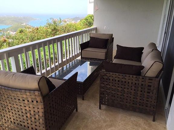 Totally remodeled 2 bed 2.5 bath condo in gated complex w/ panoramic views of Charlotte Amalie Harbor and beyond. Fully furnished/turnkey. Very private end unit with two dedicated parking spaces. All water in condo is filtered by UV water filtration system. Complex has generator, trash service, pool & tennis court. Central A/C throughout. Pet friendly.