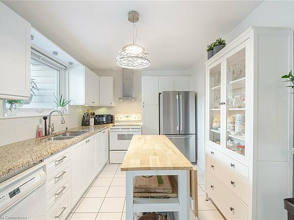 Great Family area close to schools, parks, transit, & Go Train, Detached renovated home w/ oversized double car garage w/ door opener. Landscaped fenced yard (w/ in ground sprinkler systems. Covered front porch w/ composite deck (front & back). Newer Front door, ceramic thru to kitchen, renovated w/granite counters, white cabinets & pantry, modern range hood. Large Kitchen window & backdoor to deck. LR/DR L-Shaped - hardwood floors, both rooms have large windows. 3 bedrooms & Rec Room (lower level) have laminate. All basement windows are above grade, laundry room finished with cabinets, Front load washer & Dryer, Large 3 pc Washroom w/ sliding door. Shows 10+++. Many upgrades in attachment on Listing. Roof 2023, Furnace 2015, Deck 2017, LR/DR & Kitchen upgrades, Front & Backdoors, Quartz counters, Flooring 2014-2024, garage oversized (27 x 21 ft)