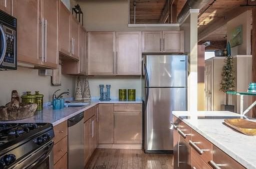 A rare opportunity to live in Biscuit Lofts! Originally the model unit & considered one of the nicest, it has three sides of ~8 ft windows, spectacular light & a hip, old-factory vibe. High ceilings, exposed brick walls & flooring exemplify loft living. The kitchen offers stainless steel appliances (gas stove, electric oven, dishwasher, refrigerator), a beautiful island, Carrera marble countertop & glass bar that look out on a spacious great room which can easily be divided into dining and living spaces. Two bedrooms, or a BR and an office. Recently redone full bath and convenient hall half bath with w/d. See floor plan. Two deeded parking spaces. Pet friendly. Elevator. There is nothing quite like it available. Only two units have sold in the last two years in this sought-after complex. Most recent sale in 8/2020 was $254/sq ft. Close to restaurants, shopping & the train station. When will something like this be on the market again? Any initial offers due by Monday, 12/14 12p