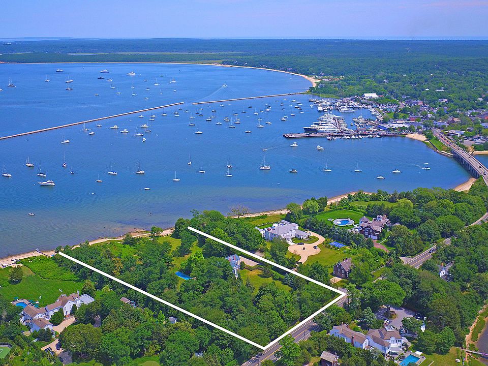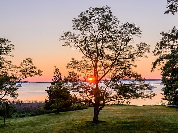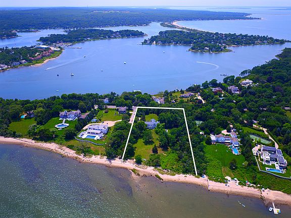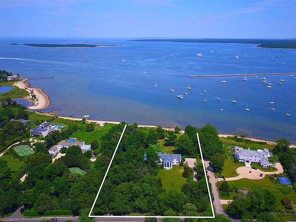 It is easy to become engulfed in nature and the Sag Harbor Village lifestyle with 4.44 +/- acres and 327 +/- feet of sandy beach overlooking the harbor, yachts, sailboats, and open bay. The breathtaking water views and sunsets are enjoyed from almost every room in this North Haven mansion. Originally built in 1843, the gracious home offers three stories, including many period details, like the grand columns covering two facades, the wide-plank old pine floors, oak banister and multiple fireplaces. The first floor features a kitchen with soapstone and marble counters, an immense living room, sitting room, formal dining, as well as a great room with another dining and sitting room, powder room, mud room, pantry and full bath. The second floor contains four bedrooms, three with ensuite baths including the impressive master suite with its own sitting room, bath and secluded terrace for the panoramic harbor vistas. The third floor houses the fifth bedroom, study, and large storage space. Well-designed gardens, specimen trees, and a bay side Gunite pool envelope the house, and Main Street's year round entertainment is only a half mile away!