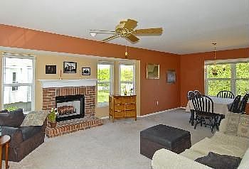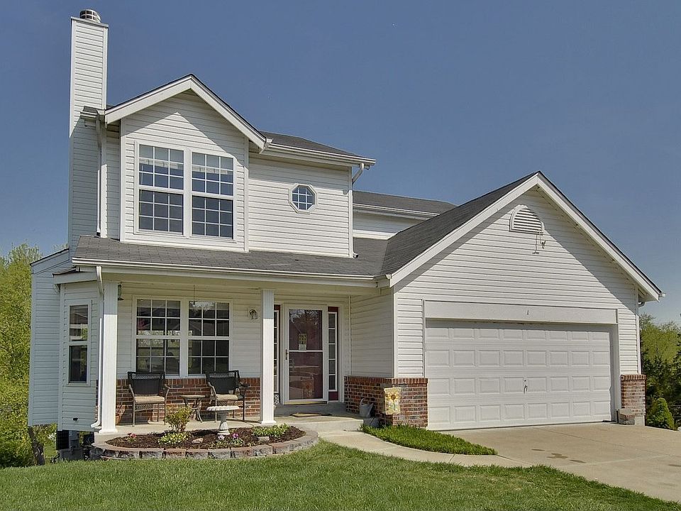 Listing agent: Dawn Krause, Call 636-549-1129 for information. This 3bed, 2.5bath 2story home is adorable and exudes charm from the moment you drive up to the low maintenance exterior with vinyl siding and brick accented elevation with covered front porch and situated in a cul-de-sac! Inside enjoy the spacious living room with bay area, fireplace, and open flow into the dining room. The kitchen offers a bright space with new stainless steel dishwasher ’09, a pantry, and a bay door area leading to the deck overlooking the common ground area. The vaulted master offers two closets and a private bath. The walk-out lower level was finished in ’06 and offers frieze carpet, a big family room w/built-in media area and a bar/office area. This home also has main floor laundry! The home is in move-in ready condition. It is a short sale.