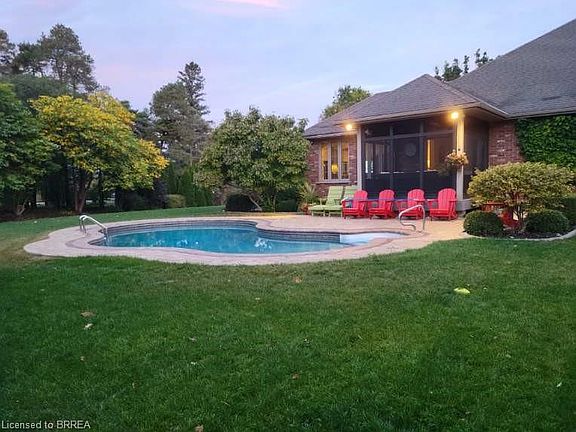 Gorgeous home sits on the nicest lot in this area. This sprawling custom built stone and brick bungalow offers fully finished upper living area with high ceilings and fully finished lower. with 9' ceilings. Three car attached garage and a separate two car 20 x 24' workshop/ garage that is insulated, heated and has hydro. From the moment the front door opens you will be amazed by the quality and workmanship of this home. Tray ceilings, pot lights, cove mouldings, real hardwood flooring throughout main living areas, porcelin tile in the kitchen and baths, gorgeous bathrooms, huge ensuite with his and hers vanitities, main floor office, 11' ceiling in great room , 10' ceilings in main floor other rooms. Kitchen is french country with gorgeous granite, centre island, oven, microwave and warming oven fridge, dishwasher, wine fridge all in stainless. Kitchen opens onto main floor family room with gorgeous views of the Muskoka like deck with sitting areas and 2020 hot tub. Side new sunroom features full windows with screens and overlooks the one year old inground pool matched in brick and cove edging to the house and separate garage. Installed by Bud's . All windows are top quality with transom's over most on the main floor. Main floor laundry, door out to garage and second staircase from garage to lower level . Two bedrooms on main. Primary has door out to deck and hot tub, walk in closet and ensuite. Lower level great for movie watching in the family room, two other bedrooms, full bath and lots of storage. Floors are heated in lower level areas and porcein tile areas in family room and kitchen.. Central air, central vac. Sprinkler system.Magnificently landscapped ! Top of the line septic system and inground pool. One of the best built homes ! Shows like better homes and gardens.