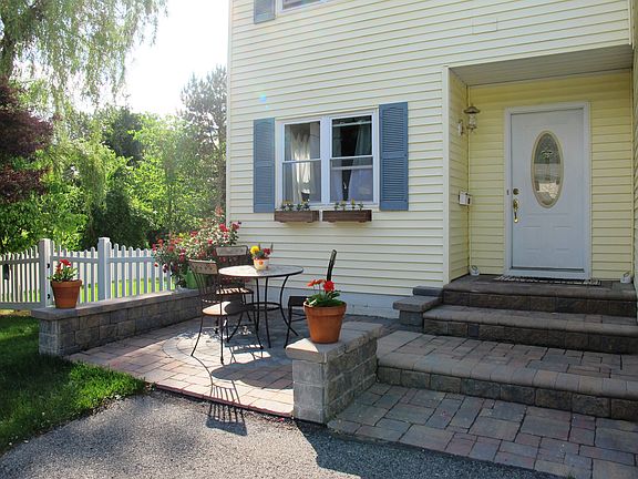 Bright, meticulously maintained townhouse located on corner lot in Fieldstone Farms (no HOA fees). Customized stonework and oversized, flat fenced-in yard bordering state land highlight the exterior of this beautiful home. Enter into large entrance way with skylight allowing in an abundance of natural light. Newly updated eat-in-kitchen with granite countertops, porcelain tiles, and stainless steel appliances create the centerpiece for this home with great flow into dining room and living room - both with pristine red oak wide plank hardwood floors. Direct access to covered deck from dining room overlooks private backyard. Upstairs find an oversized master bedroom with walk-in closet and 2 additional guest rooms - both with walk-in closets as well. Updated bathrooms with granite countertops and finished basement with ample storage complete this home. Windows replaced. Newer roof. Newer appliances. Town Sewer/Water. Truly one of a kind.
