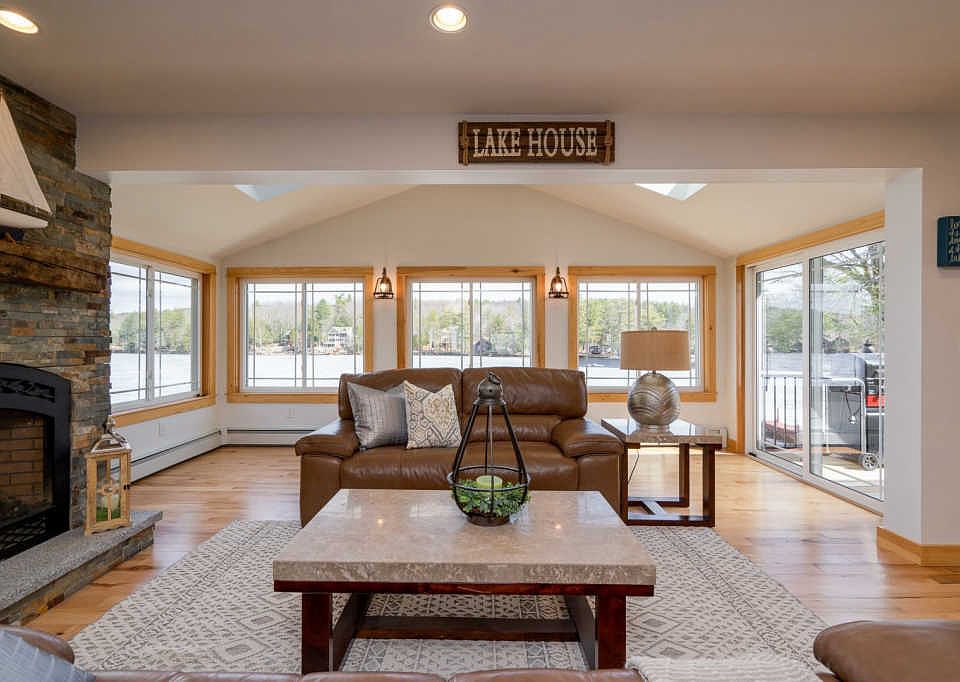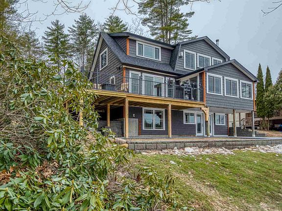 Lake Winnipesaukee 4 Bed / 4 Bath home overlooking Fish Cove in the scenic resort town of Meredith, NH. This beautiful 3000+ SF home has been completely remodeled from the inside out and offers the finest in lakefront living with top-of-the-line energy efficient upgrades. The main floor features a gourmet kitchen with stainless steel appliances, quartz countertops, and beautiful cabinets. The open concept layout offers hardwood floors throughout, a spacious dining area, an elegant living room with gas fireplace & panoramic views of the lake. You can also step out onto the private walk around deck overlooking the serene setting. The main floor also provides space for a first floor bedroom or office with attached ¾ bath. The master bedroom suite on the second level is flooded with natural light and has amazing lake views, a gas fireplace, a walk-in closet with access to the laundry room and a full bath with a whirlpool tub, double vanity and custom walk-in tiled shower. The upper level also has an additional en suite bedroom overlooking the water. The finished walkout lower level is perfect for guests, featuring a cozy living & dining area with a full kitchen, a fourth bedroom and full bath. You also have the option to rent the lower level as a short term or long-term rental for additional income. The private 527' of waterfront is shared with only 6 homes and offers a sandy beach, & designated dock space. It's also perfect for kayaking, paddle boarding, & boating.