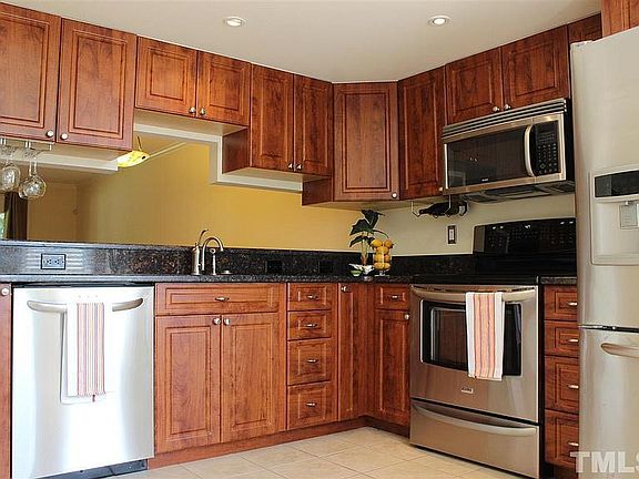 Well maintained sunny end unit townhouse style condominium conveniently located in Downing Creek. This home as 2 bedrooms, 2 and half full bathrooms, stainless appliances and granite counters in kitchen. Hardwood style laminate in living space, Tile in dining area & kitchen. Raised breakfast bar through to kitchen, Bay window breakfast nook. Great roommate set-up with private baths for each bedroom. Close to Friday Center "park n ride" and only minutes to UNC Campus and I-40. New heating and air (2017). Great POOL/TENNIS * Walking trails * Fab deck in rear *Storage closet.