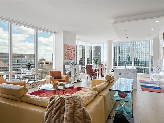 Grand Residence 3 bedroom, 3.5 bath corner home with a rare layout that lives left to right creating expansive open living space. This home has 11ft soaring ceiling height & walls of glass with dazzling views of The Custom House, Zakim Bridge, and Boston Harbor & beyond. Many custom upgrades included are hardwood & marble flooring, gas fireplace, & custom closets. The kitchen has Poggenpohl cabinets, Marble counters and seating island, Sub-Zero, Wolf, Wine storage, & Miele appliances. There’s also a modern gas fireplace in the separate den/seating area or convert back to a 3rd bedroom. The primary bedroom has 2 custom closets, wonderful light & views plus a sumptuous bath with double vanity sinks, oversized walk-in shower, and separate bathtub. Residents enjoy a full-service lifestyle incorporating the finest amenities of 24-hour concierge, doorman, 2-story Club rm, outdoor terrace, 75ft indoor lap pool,& state of the art fitness facility, Salon, & Spa. 2 Valet Garage spaces included.