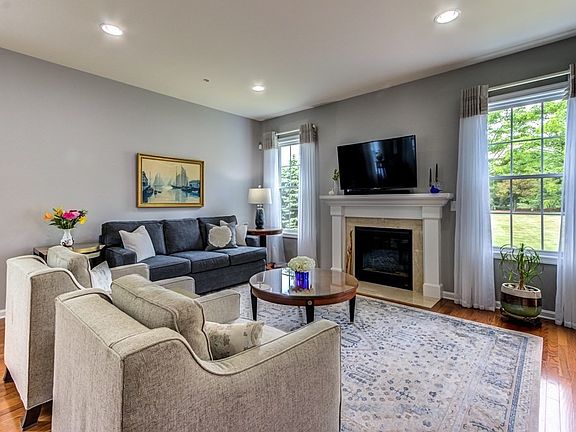 Gorgeous, brick front, MODEL townhome flooded with natural light, situated on a beautiful lot w mature landscaping in Legacy Farms. Sunny two-story foyer opens into the family room with wall-mounted TV, gas burning fireplace & columns. Cabinet packed kitchen w stainless steel appliances, gas cooking vented out & extra lighting. Dining area w crown molding, wainscotting & patio door looking out onto private deck ready for summer BBQs. Hardwoods on both floors. Primary suite features luxurious bathroom with soaking tub & walk-in closet. Secondary bedroom & the bonus room serves as a great guestroom or home office. Second-floor bath & dedicated laundry room. Lower level ready to be finished. Two zones of heat & cooling. Prime location, situated INSIDE the neighborhood next to paths/trails & huge open space to enjoy via the backyard. Sidewalks lead to Legacy North playground, downtown's top-ranked schools, farmer's market, State Park's beach & commuter rail.