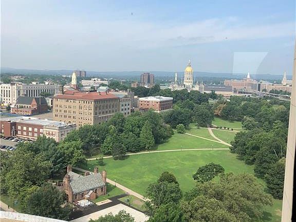 amazing views to the east of the Ct. River from this 19th floor unit as well as views to the west of the state Capitol and Bushnell Park. Galley kitchen, dining nook, living room w built ins, large walk in closet and small office space in master suite, guest bedroom and bath. Laundry on each floor, 24 hour security, parking in underground garage for two cars (space#43. Walk to downtown Condo fee on parking space $112/month