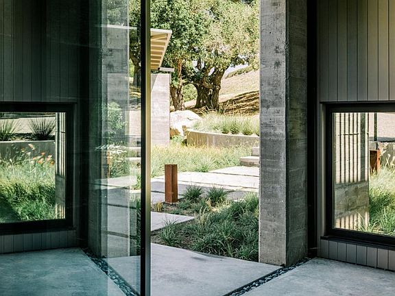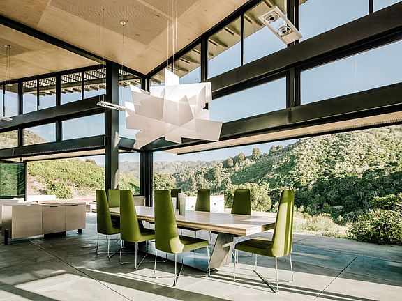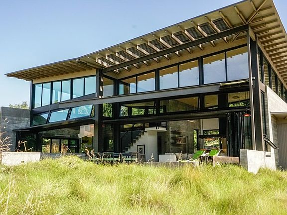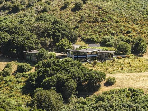 Located just inside the entry gate at Santa Lucia Preserve, the modern Butterfly house by AIA architect Jonathan Feldman sits lightly on an expansive oak studded meadow amidst 23.8 acres. Comprised of three distinct pavilions, each with a butterfly roof, magnificent views & sense of privacy. The main residential pavilion features an open concept for living, dining & kitchen with a media loft and connection to the master suite pavilion over an interior bridge & office. The two-bedroom guest pavilion allows guests their own private living space. Flowing indoor to outdoors seamlessly with expansive glass doors & windows, the owner lives as part of the natural surroundings and is sustained by the conservation elements of the design. The graceful butterfly roofs bring in views & harvest rainwater then stored in concrete cisterns.The board-formed concrete floors & walls, large glass openings and steel structure result in extensive passive thermal opportunities complimented by a solar array.