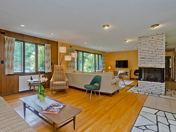 You’ve got to see this stunning mid-century ranch in the desirable Holyoke Highlands! This architectural gem combines vintage charm with modern convenience in single-level living. Upon entry, you'll find a marble-tiled foyer & hardwood floors throughout. A captivating 3-sided marble fireplace is the focal point of a spacious open floor plan, ideal for entertaining. Wow your guests in the beautifully designed modern kitchen with an elegant touch of retro. Lrg windows overlook a covered patio & back lawn bordered by a lush forest, creating a seamless connection between indoor & outdoor spaces. The 3 charming bedrooms offer large closets & plenty of shelf space. The bathroom has undergone tasteful updates without losing its original features, such as a hidden magazine rack, privacy screen, & other delightful surprises. The partially finished lower level adds even more functionality w/ a fireplace, laundry room, efficient Buderus boiler & water heater, lots of storage, and a 2nd full bath.