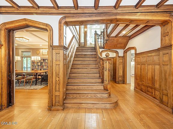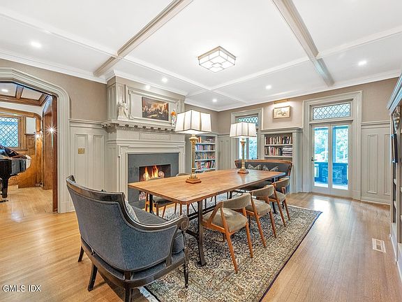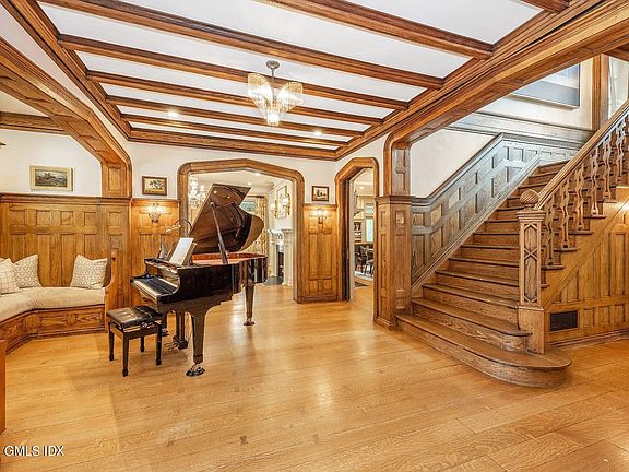 Every inch a dream family home, this 1903 architecturally significant manor enchants with its artistry & luxuries. Its many enhancements include an elegant eat-in kitchen, ample laundry- & mud-rooms, and a sparkling pool, plus graceful landscaped grounds. This home is close to In-Town locale, with sidewalks to Greenwich Ave., rail station, & schools. Throughout the light-filled interiors, refined formal details mix happily with modern upgrades in the family rooms, designer baths, versatile office, & lavish principal suite. A special bonus is the wraparound porch with its vantage views, which, together with the pool, deck, children's playground, fire pit, & 3-car carriage house, create an incomparable backdrop for enjoying life's special moments amid spectacular surroundings.