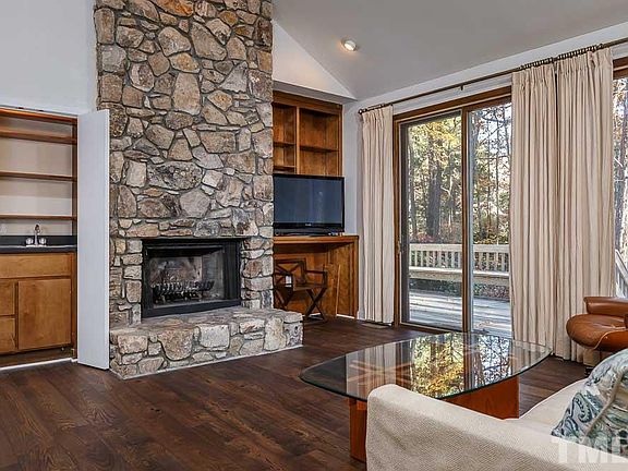 CORNER GOFORTH CONTEMPORAY IN FALCONBRIDGE! 2017 renovation for open LR/DR/kitchen flow with new quality hardwood floors thruout main floor * dramatic 2-story LR with built-ins, wet bar, floor-to-ceiling stone wood-burning FP * granite kitchen counters * tall Pella windows let the light in * expansive 44x12 deck accessible from main floor MBR & LR for enjoying outdoors * 10x6 loft * storage galore in 26x9 walk-in attic * garage work bench * neighborhood pool * super convenient to I40, airport, RTP!