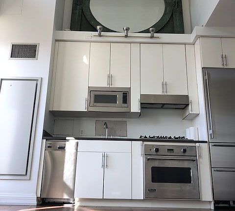 SHORT-TERM LETTING - Available Now to rent monthly or until end of September. Unique one bedroom apartment with in the historic former Williamsburg Bank Building with open views of the Verrazano Bridge from the terrace and Empire State views from the bedroom. Featuring an 16 foot double-height walls and beamed ceilings, Brazilian chestnut flooring, limestone and mosaic-tiled bathroom, and an open chefs kitchen equipped with Viking refrigerator, Viking stovetop, oven and dishwasher with lava stone countertops. Built in 1927, landmarked One Hanson Place is a premier white glove luxury condominium building. Amenities include 24-hour doorman, live-in Resident Manager, 13 full-time staff and a full-service windowed gym.