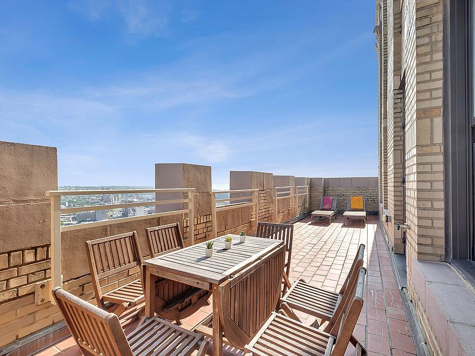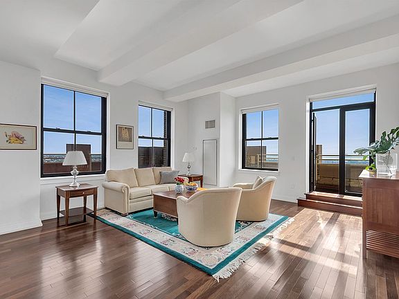 Offered for sale is Apartment 24D at One Hanson Place, one of Brooklyn’s most iconic buildings. This 2-bed, 2-bath, 1239 square foot residence offers all-day natural light and two large terraces totaling over 650 square feet of private outdoor space. Enjoy breathtaking vistas spanning historic Fort Greene to the Statue of Liberty, the Manhattan skyline and the East River, and all the way South to the Verrazano Bridge. The open kitchen includes lava stone counters, white lacquer cabinetry, stainless steel Viking appliances (a 36" refrigerator with bottom freezer, Professional Series gas vented cooktop/oven and dishwasher, and a built-in microwave). An oversized center island offers bar seating, storage and prep space. Off the kitchen you will find an eastern exposed terrace perfect for outdoor dining. The living/dining area is adjacent to the south-facing terrace. Down the hall is the generously proportioned primary bedroom. It includes a walk-in closet and an en-suite marble and granite bath equipped with a double vanity, a separate shower stall, soaking tub, and mosaic stone flooring. The second bedroom is bright with two large windows. The second full bathroom is conveniently located right across the hall. This home has a generously sized entrance foyer with a convenient over-sized coat closet, 10.5-foot coffered ceilings, wood floors, a large closet with a washer/dryer hookup, central heat and A/C and 6.5-foot dual-pane windows and glass terrace doors providing eastern and southern sunny exposures. Built during the Roaring Twenties, One Hanson’s landmark, ornate bank lobby is one of the most recognizable interiors in NYC. Building amenities include 24/7 door and concierge staff, live-in super, three landscaped and furnished high-floor terraces, 21st-floor residents’ lounge, two bike and stroller storage rooms, updated gym, windowed children’s playroom, and a game room. One Hanson anchors the South End of the expanding BAM Cultural District with direct access to the Atlantic/Barclays Terminal (New York City’s second largest transportation hub) with nine local and express subways (2,3,4,5,N,R,B,D,Q), the LIRR, the C and G trains just three blocks away. Enjoy Barclay’s, Fort Greene Park, the Apple Store, Whole Foods, artisanal food shops, designer boutiques, dozens of restaurants and a host of other neighborhood amenities. Private storage locker included. Monthly assessments $532.81, monthly storage fee $177.13 and tax abatement runs until 2024.