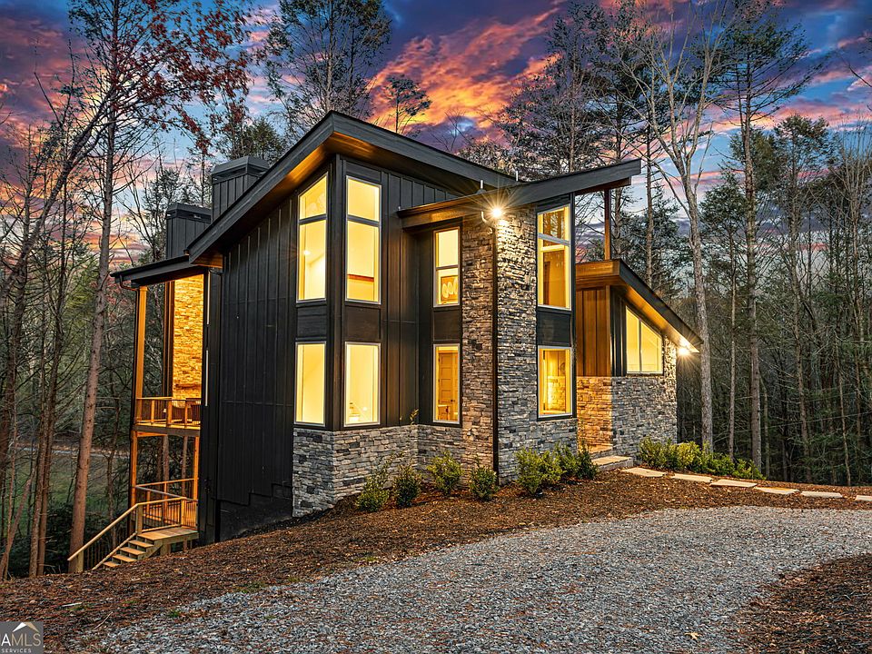 Nestled in the heart of the Aska Adventure area in Blue Ridge, this MODERN MOUNTAIN LUXURY home offers a serene escape on 2.15 acres and in a picturesque CREEKFRONT setting of over 565' of creek frontage!! With 4 spacious bedrooms, 3 full custom tiled baths and powder room on main level, the interior boasts of high-end amenities with an open floor plan featuring a spacious gourmet kitchen, custom cabinetry, oversized island for additional eating area and stainless steel appliances; greatroom is complete with floor-to-ceiling fireplace and easy access to step outside onto the spacious deck to listen to the sounds of the noisy creek; owners suite on main level with 2nd owner's suite upstairs, finished terrace level complete w/fireplace, wet-bar and additional guest rooms; lower level deck perfect to unwind in a private hot tub under the stars, ample parking and room to build a detached garage. Within minutes to kayaking & tubing the Toccoa River or boating in Lake Blue Ridge or hiking in the National Forest, super convenient to all outdoor amenities!!