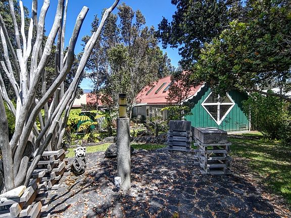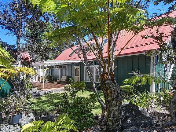 Retreat to the Rainforest - Designed by Virginia Macdonald using her passive Solar Ventilation system, this Volcano House is a light-filled cottage on the edge of Hawaii Volcanoes National Park, situated within a safe, community-oriented, family-friendly neighborhood. Smiling neighbors, dog-walkers and bicyclists enjoy the clean, crisp air. This charming 2-bedroom, 2-bathroom custom home was designed with passive ventilation for airflow and and mitigating mold and mildew, as well as keeping interior temperatures at comfortable levels. Large windows frame serene and picturesque views from dining, living and bedroom areas. Skylights flood the house with natural light throughout the day. The Master Bedroom has high ceilings and shoji screens capturing the warm, dappled afternoon light, as well as en suite bathroom, custom wooden built-ins, walk-in closet and a stunning Japanese inspired bath-house with two person soaking tub. The Guest Bedroom is spacious and whimsical, featuring an upper loft for additional sleeping or an additional office space. ?This beautiful home boasts a large family and recreational room with high, open-truss, t&g ceilings and a cozy, wood-burning fireplace. The adjoining 2-car garage is perfect for parking, storage or workshop. A large concrete cistern provides catchment rainwater for the house with sediment and UV filtration in the kitchen. The covered sunporch and brick patio provide a peaceful outdoor living space. ?The beautifully manicured garden features camelias, bay leaf, ohia, koa trees, cherry blossom and king protea. A stone wall creates a privacy screen between the house and road. Beyond the large, fenced yard is a large communal area shared by neighbors. Volcano on the Big Island, is a haven for artists! Many live here permanently and many come to Volcano for to be inspired by its beauty and powerful landscape. Native bird species abound and vibrant gardens bloom year-round. And a weekly fabulous Farmer's Market!