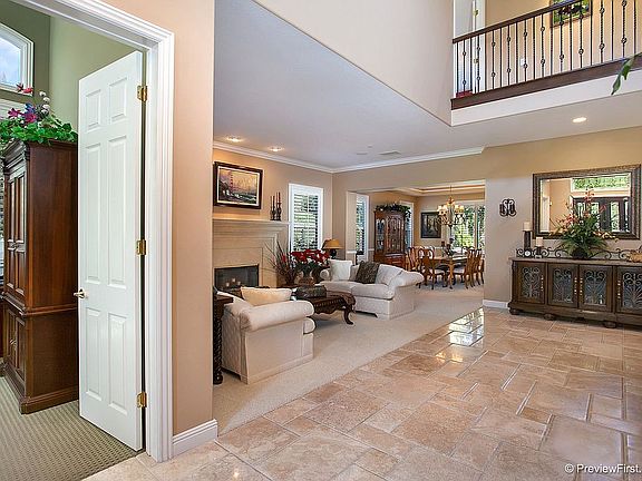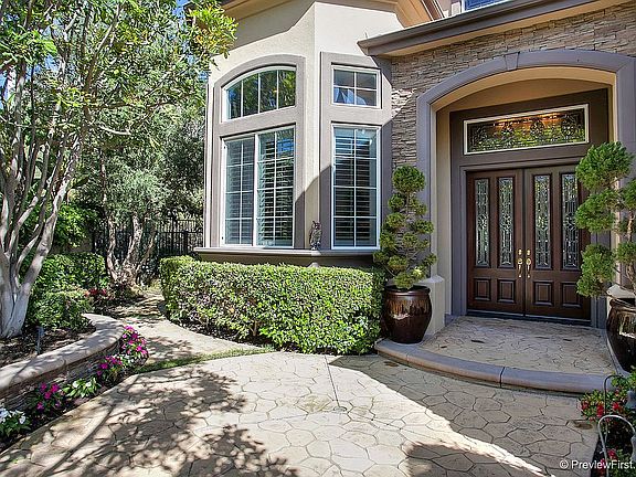 Located in the privately gated Oak View, this home features unobstructed views of the Coto Valley & Saddleback Mountain, 5 bedrooms, 4 ½ baths, executive office, bonus room, gourmet chef kitchen, formal living room & dining room, 3 fireplaces. Entering leaded-glass double-front doors into the grand foyer where upgrades begin with Travertine floors, custom chandelier, plantation shutters, Travertine fireplace,library/office, formal living & dining rooms and wrought iron staircase. Gourmet Kitchen with Uba Tuba granite counters,GE Monogram stainless steel appliances, island with prep sink, walk-in pantry, built-in desk and is wide-open to the family room w/built-in TV system, marble faux paint fireplace.Main floor also features a powder room, bedroom w/ensuite bath, walk in closet & exterior access. Upstairs features 3 spacious bedrooms, custom closets, 2 full baths,bonus/game room. Master suite w/fireplace, retreat, bath with jet spa tub,walk-in closet & deck w/expansive views. The incomparable backyard amenities begin with Pebble-Tec salt water pool & spa, water slide and waterfall, putting green, sport court, built-in BBQ with seating, granite counter top, Surround Sound System, fire pit, grass areas,dog run, garden, Avocado and fruit trees.